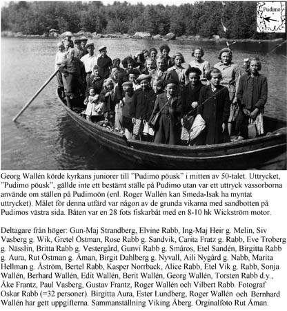 Kyrkans juniorer. Georg Wallén körde kyrkans juniorer till ”Pudimo-pöusk”. Båten var en 28 fots fiskarbåt med en 8-10 hkr Wickström motor. Deltagare från höger: Gun-Maj Strandberg, Elvine Rabb, Ing-Maj Heir g. Melin, Siv Vasberg g. Wik, Gretel Östman, Rose Rabb g. Sandvik, Carita g. Rabb, Eve Troberg g. Nässlin, Britta Rabb g. Vestergård, Gunvi Rabb g. Småros, Etel Sandén, Birgitta Rabb g. Aura, Rut Östman g. Åman, Birgit Dahlberg g. Nyvall, Aili Nygård g. Nabb, Marita Hellman g. Åström, Bertel Rabb, Kasper Norrback, Alice Rabb, Etel Wik g. Rabb, Sonja Wallén, Berhard Wallén, Edit Wallén, Berit Wallén, Georg Wallén, Torsten Rabb d.y., Åke Frantz, Paul Vasberg, Gustav Frantz, Roger Wallén och Vilbert Rabb. Fotograf Oskar Rabb (=32 personer). Birgitta Aura, Ester Lundberg, Roger Wallén och Bernhard Wallén har gett uppgifterna. Sammanställning Viking Åberg. Originalfoto Rut Åman. Text i bilden.