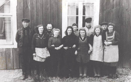 Kuni skofabriks arbetare: Fr. v. Vilho Koivisto, Aina Grop g. Wahlström, Johannes Kuni, Oline Wik g. Örn, Elna Örn g. Forsman, Gösta Örn, Alice Wik g. Haldin, Sanfrid Örn (Brännbacken), Heli Koivisto, Karl Kuni, Ester Örn g. Lundberg.