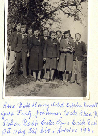 Ungdomar på biobesök i Kvevlax: Fr. v. : Arne Rabb, Harry Udd, Edvin Enroth, Greta Frantz g. Vestergård, Johannes Wiik, Alice Rabb, Oskar Rabb, Ester Örn g. Lundberg, Erik Rabb