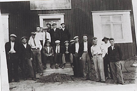 Café Midgård Handel Emil Rabb Tel. 32 = texten på skylten ovanför dörren 1935. Stående fr. v. Sanfrid Örn, Georg Åberg, Edvin Strandberg, Anders Rabb, Helge Örn, Emil Lundberg, Sanfrid Strandberg, Harald Åman, Victor Ahlskog (Sandören), Edvin Wallén, Emil Hinders, Evald Beijar, Erik Öman, Gilbert Heir. Sittande fr. v. Arvid Åberg, Fritjof Wik, Sanfrid Hinders, Hugo Strandberg. Ungkarlarna samlades vid cafeét på söndagsförmiddagarna, under dagens lopp gick en del hem och nya kom till. Av det här fotot gjordes kopior, som såldes i butiken, berättar Ester Lundberg som skötte barnen och passade upp i cafeét på söndagarna.