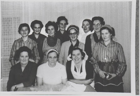Matlagningskurs i Marthagården. Sittande från vänster: 1. Anni Beijar, 2. Etel Frantz, 3.Kursledaren Maj-Britt Backlund, Stående från vänster: 4. Anni Byström, 5. Dagny Östman, 6. Margit Hinders, 7. Ester Lundberg, 8. Ros-Maj Vestergård, 9. Astrid Rabb, 10. Vera Örn, 11. Elin Östman.