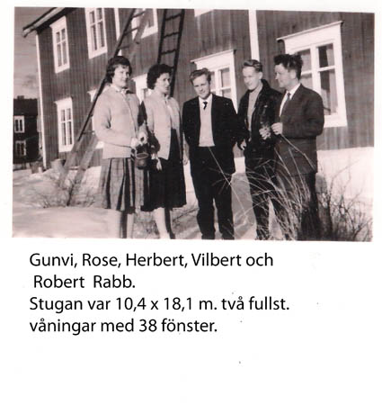 Gunvi Rabb g. Småros, Rose Rabb g. Sandvik, Herbert Rabb, Vilbert Rabb och Robert Rabb framför stugan. Text i bilden. Gunvi Småros Rose Sandvik