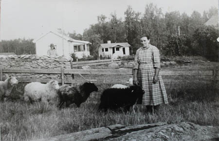 Bodstranden "Lindos Fiina" = Josefina Örn med sin fårfarm framför sin stuga, i bakgrunden "Båskas-Maijas" stuga på Hinders = Maria Eriksdotter Skåtar g. Hinders (1851-1933) till höger Irene Hinders stuga bakom bersån.