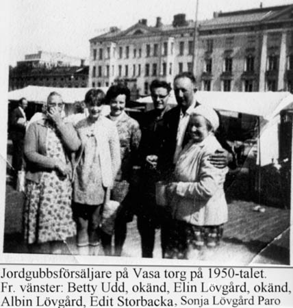 Jordgubbsförsäljare: Fr. v. Betty Udd, Sonja Lövgård g. Paro, Elin Lövgård, Runar Örn, ?, Albin Lövgård och Edit Storbacka.