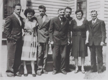 Johan Mälsor-Eriksson i Amerika. I mitten Johan Mälsor f. 1863 från Hagnäs och hans fru Sofia Knip-Smeds, Vassor, senare Eriksson, till höger dottern Anna med maken Theodor Eriksson från Munsala. De övriga Johans och Sofias barnbarn. Från vänster: 1. Marvin Eriksson, Thelma Eriksson Cannon, 3. Theo Eriksson Jr. 4. Johan Mälsor-Eriksson, 5. Robert Eriksson, 6. Anna, dotter till Johan, 7. Theodor Eriksson och Anna. Theodor var född i Munsala. Johan Mälsor, Skata-Joss från Hagnäs föddes 1863 och växte upp faderlös med sin mor Brita i en liten backstuga norr om Nyfossas på ”Gambäskatan”. I 20-årsåldern emigrerade han till USA, Gladstone, och tog där namnet Eriksson. Han gifte sig med Sofia Smeds från Smedis i Vassor. Se fler bilder sök: "johan+mälsor"