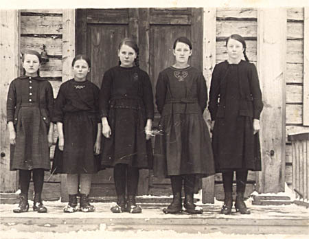 Folkskolflickor: Fr. v. Astrid Udd f. 1911, Sigrid Heir f. 1910, Elna Wik f. 1911 (Nysto), Ester Storbacka f. 1911 g. Ohlis, Maria Sandvik f. 1911 (Lärarinna bl.a. i Lappfjärd) .