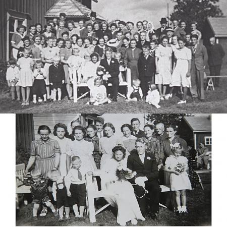 På nedre bilden längst till vänster ser vi Ingrid Åberg f. Östman som försöker hålla styr på Viking. Till höger om Ingrid Gertrud Åberg g. Wiik, Agda Åberg g. Östman med Henry och Rudolf. Till höger om Agda står Anna Öman g. Åberg och Rafael Åberg. Bakom Hildur står Gerda Åberg, Sigrid Åberg g. Hellström och Maria Åberg. Längst till höger står Gunvor Östman g. Svarvar med blommor (brudnäbb). Damen längst till höger är Roberts mor Ida Mälsor f. Örn och till vänster om henne Roberts farfar Karl Gustav Mälsor (1864-1953) och Roberts far Johannes Mälsor.