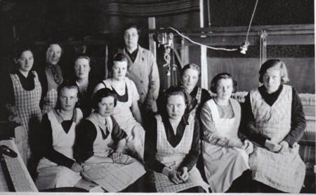 Vävkurs på Västerbacken. Kursdeltagare i vävsalen i Rabb-Antas gård (senare Nässlins). Från vänster: 1. Etel Sandén, 2. Sylvia Dahlberg g. Wasberg, 3. Signe Örn g. Kjellman, 4. Senny Forsman g. Forsman, 5. Hildur Åberg g. Mälsor, 6. Ida Beijar g. Sandén g. Näsman, 7. Edit Rönnbacka, kursledare, 8. Etel Östman, 9. Sylvia Beijar, 10. Astrid Udd och 11. Vera Wasberg g. Örn