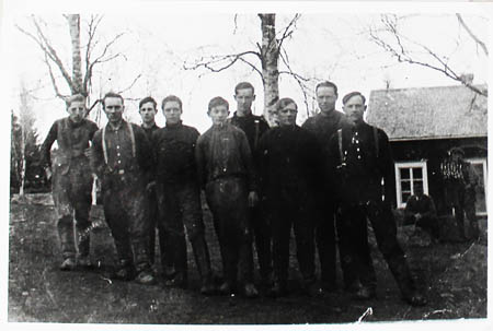 Slöjdkurs vid gamla barnskolan i Vassor. Barnskolan användes senare som tvätt- och bagarstuga. Från vänster: Albin Strandberg, Emil Vestergård, Karl Nymark, Sigurd Wikman emigrerade till Kanada 1928, Evert Sandén, Vikman, okänd, Albert Wik och Lennart Hellman.