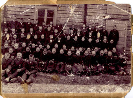 Konfirmander: I mitten sitter kyrkoherde Klas Edvin Karsten (1877–1908) och klockaren Johan Hanelius (1878–1900).