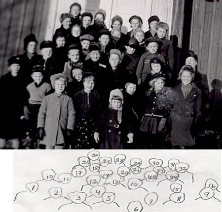Söndagsskolfoto 1941 i Gamla bönehuset. Lär. Senny Örnberg och Ester Rabb (med glasögon) 1 Inga Vestergård, 2 Bengt Vestergård, 3 Vivan Rabb, 4 Herbert Rabb, 5 Anna-Lisa Wik, 6 Gunvor Östman, 7 Elvine Rabb, 8 Berit Vestergård, 9 Gunnel Ivars, 10 Senny Örnberg, 11 Edvin Vestergård, 12 Torsten Rabb, 13 Robert Rabb, 14 Bengt Eurs, 15 Bror Nyman, 16 Ester Rabb, 17 Anita Heir, 18 Viola Rabb, 19 Alfons Ivars, 20 Bertel Wik, 21 Anne Nyman, 22 Torbjörn Rabb, 23 Gunhild Nyman, 24 Manne Wiik, 25 Evert Rabb, 26 Margit Örn, 27 Kurt Östman, 28 Astrid Stenman, 29 Berta Vestergård, 30 Regina Rabb, 31 Astrid Rabb, 32 Rune Svarvar.