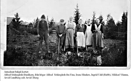 Potatisupptagning hos ”Vestäback-Joss” (Johan Abrahamsson Åman/Södergård). I ”Föisoåkrin” nedanför f. d. Nässlins. fr. v. Arvid Åberg, Arvid Lundberg, Hanna Wikman, Ingrid Udd g. Rabb, Irene Hinders, Alfred Södergårds fru Josefina f. Berg i Rimal.