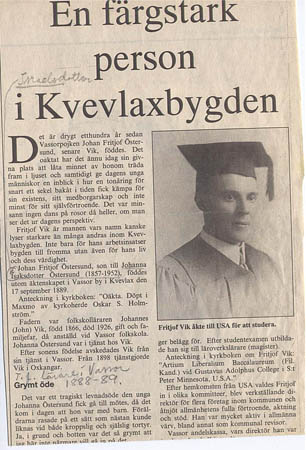 Fritjof Wik i skoluniform. Klipp ur Vasabladet 11.12.1993 skrivet av Alvine Holmlund. Fadern var ogift då Fritjof föddes. Fritjof var direktör för Vassor Andelskassa och direktör för Kvevlaxbygdens brandföräkringsförening från 1938 till sin död 1957. Han bodde på Laggen (Hansas) där han också hade sitt kontor.
