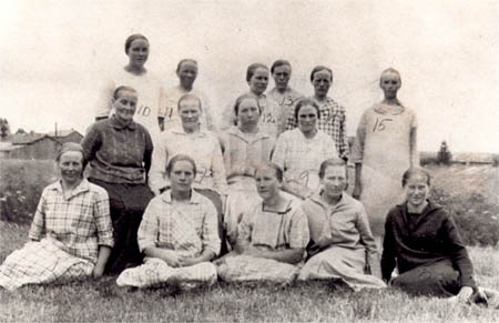 Damer i Vassor fria församling samlade för fotografering vid bönehuset i Trättgärdan år 1927. Första raden fr. v. 1. Katarina Wik. 2. Gerda Åberg. 3. Ester Rabb. 4. Ida Svarvar. 5. Anni Klemets. Mellersta raden fr. v. 6. Maria Klemets. 7. Anna Maria Wik . 8. Sigrid Wik . 9. Hilma Örn. Bakersta raden fr. v. 10. Sigrid Klemets. 11.Maria Wik . 12. Irene Hinders. 13. Davida Wasberg. 14. Maria Örn. 15. Sigrid Heir.