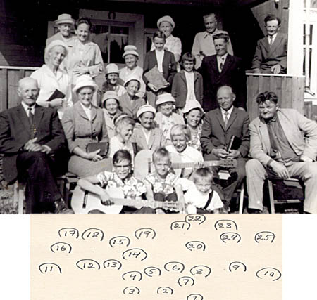 Pingstvänner har möte på Källbacken (Hildur och Teodor ägde då gården). 1.Klas Öman. 2. Göran Öman. 3. Göte Öman. 4. Christina Åberg gift Rådman. 5. Agda Åberg gift Östman. 6. Irene Hinders. 7. Gretel Hinders gift Mantere. 8. Elin Öman. 9. Robert Östman. 10. Ragnar Rabb. 11. Otto Östman. 12. Anni Klemets. 13. Anna Åberg f. Öman. 14. Senny Örnberg. 15. Ingrid Åberg f. Östman. 16. Signe Bäck. 17. Davida Wasberg. 18. Alice Uddström. 19. Sigrid Klemets. 20. Carita Åberg gift Antell. 21. Ralf Englund (Anita Forsells son i Sverige.)22. Hildur Forsell f. Strand. 23. Matias Hakala från Vörå. 24. Rafael Åberg. 25. Arvid Åberg.