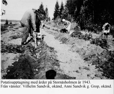 Potatisupptagning på Stornäsholmen: Vilhelm Sandvik, ?, Anni Sandvik g. Grop och ?.