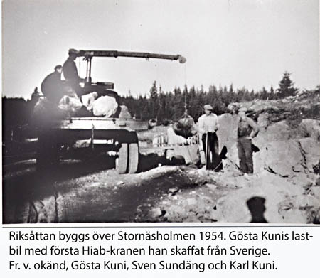 Vägbygge över Stornäsholmen, Gösta Kunis lastbil med HIAB-kran, fr. v. ?, Gösta Kuni, Sven Sundäng och Karl Kuni