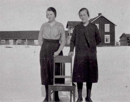 Maria Sandvik f. 1911 och Helga Örnberg g. Hinders f. 1910 (till höger). Alfred Örnbergs gård i bakgrunden