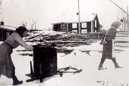 Gerda Åberg och Hildur Åberg g. Mälsor drar vatten till fähuset från Tegelhusbrunnen nedanför Åbergs