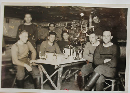 Soldater firar jul i korsu, troligen julen 1942. Arvid Åberg sitter andra från vänster, fortsättningskriget. Soldat