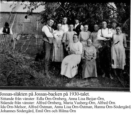 Jossas släkten (Johan Örn) på Jossasbacken på 1930-talet. Sittande: 1. Edla Örn 2. Mor Anna Lisa Örn f. Beijar. Stående från vänster: 3. Alfred Örnberg 4. Maria Wasberg g. Örn 5. Alfred Örn 6. Ida Örn g. Mälsor 7. Alfred Östman 8. Anna Lisa Örn g. Östman 9. Hanna Örn g. Södergård 10. Johannes Södergård 11. Emil Örn 12. Hilma Örn.