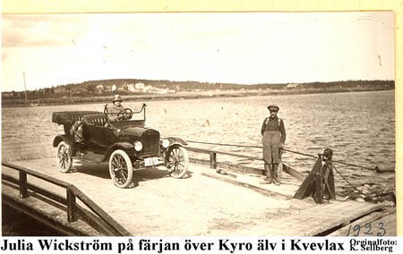 John Wickströms bil på färjan i Kvevlax. Julia Wickström sitter i bilen. Ansökan om registrering har kommit till motorfordonsregistret 15.7.1922. Bilen VA 19 var en Ford personautomobil som vägde 750 kg försedd med 4-cylindrig explosionsmotor med cylinderdiameter 9,5 cm och slaglängd 10,2 cm. Den hade 20 hästkrafter, pneumatic-ringar (luftringar) och var registrerad för 4 personer.
