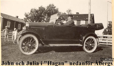 John Wickströms bil i ”Hagan” nedanför Åbergs. Då John kom från Vasa på lördag eftermiddag parkerade har ibland på Isak Södergårds "Tellbak-Isaks" tomt och ibland på Åbergs sida om den egna tomten som inte var stor. I bilen sitter John och hustrun Julia. Bland barnen finns ders barn Carl-Gustav och Ingrid. Åbergs stuga har pärttak vilken hjälper till med dateringen. Brunnsvippan och stången syns till höger.