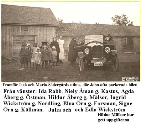 Wickströms bil på Isak Södergårds gård. Fr. v. Ida Rabb, Niely Åman g. Kastus, Agda Åberg g. Östman, Hildur Åberg g. Mälsor, Ingrid Wickström g. Sellberg, Elna Örn g. Forsman, Signe Örn g. Källman, Julia Wickström och Edla Wickström. Bilen står strax norr om Wickströms stuga.