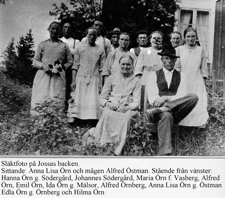 Anna Lisa Örn g. Östman med anhöriga och bekanta på Jossas backen. Sittande: Anna Lisa Örn f. Beijar och hennes måg Alfred Östman (Brännbattjin). Stående från vänster: 1. Hanna Örn g. Södergård 2. Johannes Södergård 3. Maria Wasberg g. Örn 4. Alfred Örn 5. Emil Örn 6. Ida Örn g. Mälsor (g. m. Johannes Mälsor) 7. Alfred Örnberg 8. Anna Lisa Örn g. Östman 9. Edla Örn g. Örnberg 10. Hilma Örn.