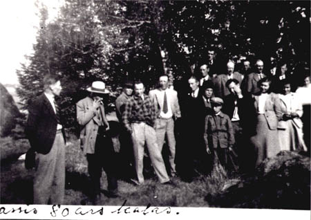 Johannes Nyfors (Krigar) 80-årskalas. Från vänster: 1. Einar Nyman 2. Johannes Nyfors 3. Verner Rönnberg 4. Ingmar Grop 5. Albin Lövgård 6. Viljam Finne ? 7. John Lövgård 8. Valfrid Södergård 9. ? Örn 10. ? pojken 11. Eskil Örn 12. Runar Berg 13. Johannes Grop 14. ? 15. Estrid Berg 16. ? 17. Hemming Örn 18. Gunvor Berg 19. Oline Örn