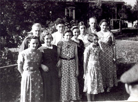 Grupp på Åbergs gård framför Wickströms gård. 1. Etel Örn g. Frantz 2. Birger Häggkvist 3. Agnes Udd g. Wasberg 4. Arvid Åberg 5. Hildur Åberg g. Mälsor 6. Astrid Udd 7. Gerda Åberg 8. Gertrud Åberg g. Wiik 9. Robert Östman 10. Agda Åberg g. Östman.