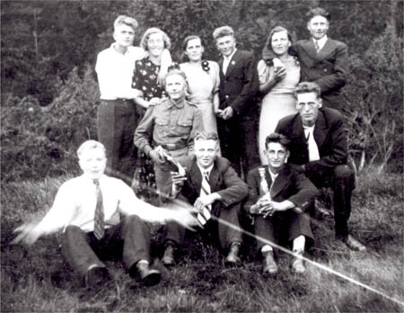 Rudolf Udd (sitter), Elis Örn, ?, Harald Åman (i uniform), ?, Ragnar Rabb, Sigurd Nykvist, Paul Norrgård (sitter), ?, Sanfrid Örn, fotograferade i skärgården