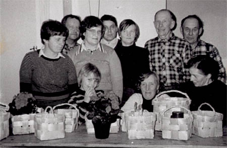 Kurs i pärtkorgsflätning hos Britta och Edvin Vestergård i f.d. Arvid Storbackas hus på Ånäset, hösten 1982. Främre raden från vänster: 1. Lisa Frantz f. Örn 2. Lena Småros 3. Aili Nabb f. Nygård 4. Etel Sandén. Bakre raden från vänster: 5. Robert Rabb 6. Gunvi Småros 7. Lars Småros 8. Britta Vestergård 9. Evald Frantz, lärare 10. Runar Nabb.