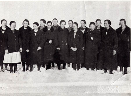 Husmödrar (marthor) på kurs. Från vänster: 1. ? 2. Ida Berg 3. Sylvia Beijar g. Hedkrok 4. Maria Hinders (Båskas) 5. Maria Nyman 6. Signe Rönnback, lärare 7. Maria Wik g. Örn 8. Gerda Åberg 9. Ingrid Östman g. Åberg 10. Sigrid Wik 11. Edit Hinders 12. ? 13. Helga Örnberg 14. Hulda Södergård 15. Maria Sandvik.