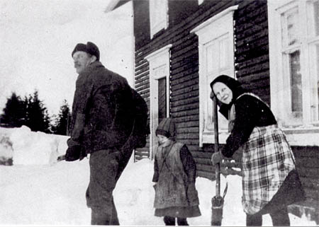 Isak Erik Smeds (Hagnäs f. 1884) skottar snö, dottern Senny Smeds g. Lövgård f. 1914 sköter kvasten och från granngården kom Valdine Friberg g. Örn