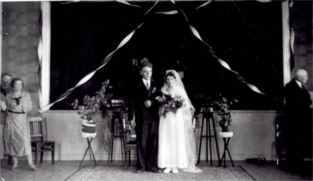 Bröllop i Vassor Uf:s lokal 1935, Fanny Frantz (Smedis) och Birger Strand i Wassor Ungdomsförenings lokal. Emigrerade till USA via Sverige