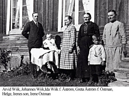 Familjen Arvid Wiik: Arvid Wiik, sonen Johannes Wiik, Ida Wiik f. Åström, Greta Åström f. Östman, Helge Örn (Irenes son) och Irene Östman (hon var första som begravdes på Fridhem begravningsplats 1935)