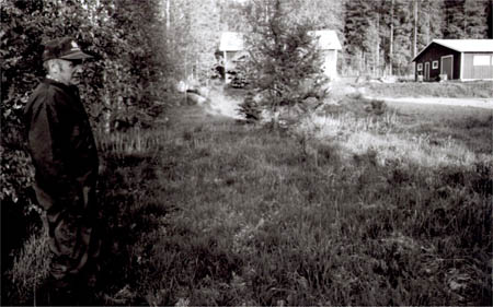 Hagnäsbild: Här stod Edla Fribergs stuga. Sanfrid Friberg visar stället, hans svingård syns i bakgrunden