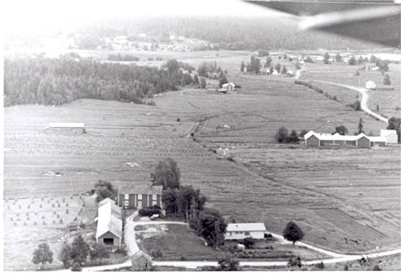 Flygfoto ca 1967 över Hugo Vasberg ”Villis”, Trätgärdan, i högra kanten Dalas (John Rabb). Mellan Dalas och Sandåsen ses Ny-Strandbergas, Andelshandeln och Marthagården.