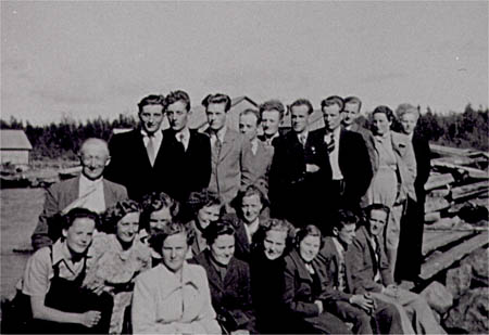 Utfärd till Björköby Uf. Foto vid Svedjehamn: Fr. v. stående: Jarl Udd, Rolf Vestergård, Bertel Wik, Sven Ivars, Harry Beijar, Joel Friberg, Bertel Södergård, Ruben Studd, Gertrud Åberg, Edvin Vestergård. Sittande: Rigmor Nyman, Vilhelm Sandvik, Helvi Koivisto, Barbro Nyman, Regina Rabb, Anna Lisa Wik, Viola Rabb, Gunnel Ivars, Inga Vestergård, Vivan Rabb, Gösta Örn och Johannes Wiik. Färden gick till Alskat med Sven Ivars lastbil och från Alskat med motorbåt till Björköby. Foto vid Svedjehamn