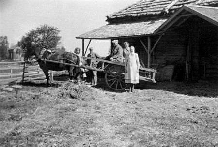 Vid Nytomtrian på 1950-talet. Personerna från vänster: Alli Wik, Bertel Wik, Albert Wik, Saga Wik och Ida Wik. Hästen Brunin är förspänd en höflake. I bakgrunden syns Edvin Strandbergs stuga, då ännu obrädad.