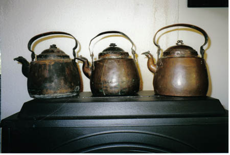 Tre Vassorpannor. Den till vänster är på handtaget stämplad ”J Wikström”, den mittersta ”J. Wennberg” och den till höger ”J-E Södergård”. Kaffepannorna är fotograferade hos Viking Åberg