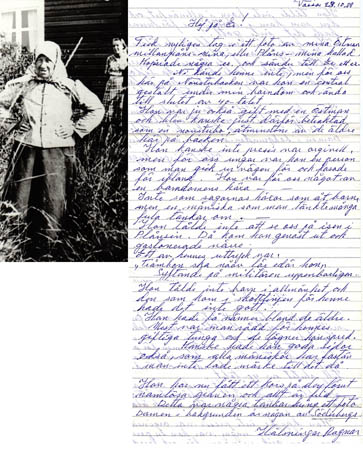 Vilhelmina Östman/Jern/ Storstens f. Staffans i Sundom 1860. ”Millangrånns Mina el. Plåns Mina”. En amper kvinna, hade sonen Isak f. 1855. Gift andra gången med skogsförman Israel Östman. Ungdomarna retade henne. I bakgrunden Ingrid Östman g Åberg.