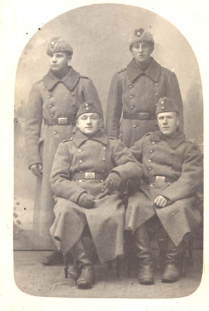 I värnplikten, i bakre ledet: Gunnar Hellman och Johannes Åman (Sandåsen). Framför: okänd och Johannes Wik (Nygols)