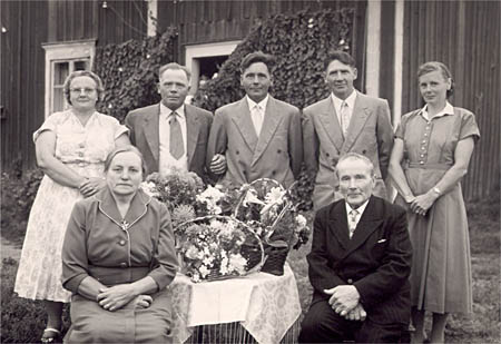 Släktmöte vid Nyback (Vestergård). Sittande: Hanna Wik f. Mörk och Viktor Wik. Stående: Elsa Wasberg, Jakob Hellman, Alvar Hellman, Gunnar Hellman och Elna Wik (Gunnars fästmö).
