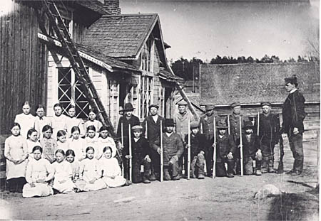 Gevärsexercis vid Kuni folkskola våren 1917. Skolan var inrymd i Alfred Nymarks gård. Längst till höger lärare Anders Pass med ”gevär för fot”. Pojkarna är utrustade med trägevär som de tillverkat på slöjdtimmarna. Pass var lokalchef för Kvevlax skyddskår och ”eksäärar” med ett ”äkta” gevär. Flickorna i första raden från vänster: Signe Rådman, Ida Forsman, Tyra Haldin, Sigrid Studd, Adele Örn. Flickorna i andra raden: Ida Nymark, Frida Grop, Aili Skog, Irene Forsman, Helmi Mälsor, Elsa Ingman, Signe Rönnberg. Flickorna i tredje raden: Edit Studd, Irene Grop, Aina Studd, Lydia Nyman, okänd. Pojkarna i första raden: Georg Back, Verner Nymark, Johannes Grop, Johannes Kuni, Lennart Paro. Andra raden: Lennart Sandvik, Verner Mälsor, Valfrid Skog, Verner Rönnberg, Albert Rönnberg, Albin Stenman.