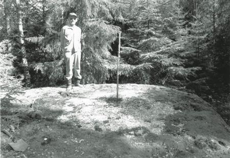 Soluret vid klockarhällan, Kullomossen. Robert Östman (Norrstu) på bilden som finns i kuvert nr 805 i Riksarkivet. Hällan tillhörde senare Bjarne Östman och fanns till 1910 på Vassor bys mark.