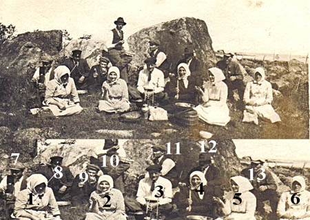 Aspskärsgrundet 1. Ellen Wasberg g. Rabb, 2. Maria Rabb g. Nyman, 3. Emil Wasberg, 4. Ester Östman g. Dahlberg. 5. Helmi Åström f. Rabb, 6. Ida Hinders g. Nyman, 7. Albert Wik, 8. Artur Sandvik, 9. Holger Nässlin, 10 Hugo Vasberg, 11. Jakob Östman (Lövis/Norrstu), 12. Johannes Rabb (Antasin/Sandåsen), 13. Edvin Nyman. Platsen är Vassorbornas fiskeläge på Aspskärsgrundet i Mickelsörarna. Fotografen har stått på den plats där Alf Hellmans stuga står och bilden bör alltså vara tagen innan stugan byggdes 1923.