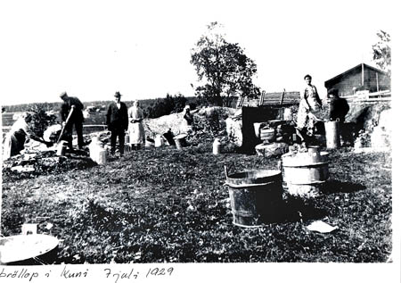 Ida Forsman och Einar Sandviks och Edit Forsman och Lennart Sandviks bröllop i Kuni 7.7.29 (dubbelbröllop mellan två syskonpar) i Kuni 7.7.29. Maten kokades bakom Marthagården.