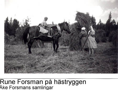 Höbärgning vid Forsmans, Rune Forsman på hästryggen. Irene Forsman och Elvi Forsman.